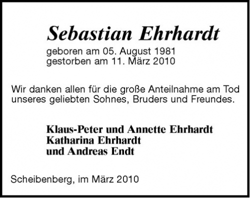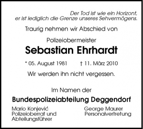 Die 2. EHu nimmt Abschied von Sebastian Erhardt Am 11. März 2010 hat sich Sebastian Erhardt mit 28 Jahren in der Bundespolizeiakademie in Lübeck aus privaten Gründen das Leben genommen. Vom 24. 07 2004 bis zum 31.08 2007 war er Angehöriger der 2. Einsatzhundertschaft. Dort wurde Sebastian, genannt Smiley, ein sehr guter Freund und Kollege. Von Anfang an war Sebastian allen gegenüber sehr offen und beliebt. Nicht nur bei Einsätzen wie der WM 2006 oder beim G8 Gipfel 2007 in Heiligendamm hatte er neben seiner stets guten Arbeitsleistung immer ein offenes Ohr für seine Kollegen. Seine gesamte Art und sein Wesen, seine gute Laune bei Feiern nach Dienst oder bei LAN-Partys sowie seine stets fröhliche Ausstrahlung machten uns den Abschied umso schwerer. Er wird uns fehlen und ewig in guter Erinnerung bleiben. Am 16. März 2010 haben wir als Angehörige der 2. EHu in seinem Heimatort Scheibenberg in tiefer Trauer und Stille einen sehr bewegenden Abschied von unserem guten Freund und Kollegen genommen. Ruhe er in Frieden. Text : POM Hausmann, POM Riese PMìn Wonneberger