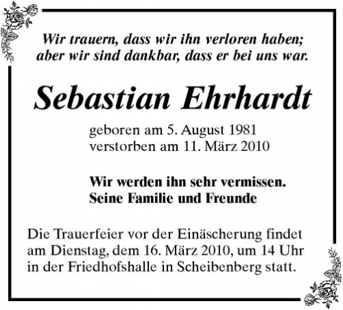 Wie soll ein Mensch denn das schaffen können? Warum hast du uns mit dem ganzen Schmerz zurückgelassen und warum haben wir keine Chance alles rückgängig, anders, vielleicht besser zu machen? Sebastian, warum hast du diese Entscheidung getroffen, warum so endgültig, warum so grausam? Manchmal bin ich es leid, darüber nachzudenken, nicht so leben zu können, wie ich es gerne würde! Es ist so schrecklich nachts im Traum dein Gesicht vor mir zu sehen und dann aufwachen zu müssen und zu wissen, dass man nie wieder mit dir sprechen kann, nie wieder dein typisches Sebastian-Lachen sehen und hören kann! Warum sollten einige Menschen unter deinem Tod leiden? Warum hast du dir nicht helfen lassen, warum müssen so viele Menschen jetzt leiden, weil du dir nicht helfen lassen wolltest/konntest? Manchmal frage ich mich, wie es weiter gehen soll und ich sehe oft nur Dunkelheit! Ich will endlich wieder mein Leben leben können, ohne diesen ständig mich begleitenden Schmerz und die Forderung an mich selbst nicht fröhlich sein zu dürfen! Ich habe es nicht verdient, sage ich mir dann im Stillen! Dabei glaube ich, dass du zu einem früheren Zeitpunkt wahrscheinlich das von mir gefordert hättest! Das ich fröhlich bin und lache! Aber es geht einfach so oft nicht! Immer ist diese gedrückte Stimmung, die mich oft fast erdrückt und mir die Luft nimmt! Die Luft, die ich so dringend bräuchte um von vorne anzufangen! Ich will doch einfach nur wieder LEBEN dürfen, zwar mit dir im Herzen, aber nicht in einem von dir bestimmten Leben! Ich will mich endlich von dir los machen, ohne dich zu vergessen! Denn vergessen wirst du von mir nie! Weil du trotz unserer letzten Begegnung einer der Menschen warst, der mein Leben im positiven Sinne geprägt hat. Nur will ich endlich frei sein und das Hier und Jetzt leben! Ich werde dich nie vergessen und immer im Herzen tragen!