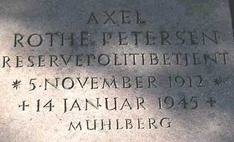 Reservepolizist Axel Rothe Petersen (5 November 1912 - 14. Januar 1945) war seit dem 17. März 1944 bei der Polizei Kopenhagen. Am 19. September 1944 wurde er von der Gestapo verhaftet und nach Deutschland in das KZ in Mühlberg verschleppt. Hier starb er am 14. Januar 1945.