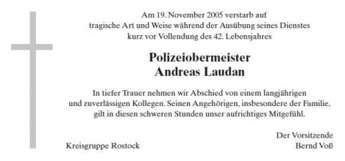 Andreas wurde während einer Unfallaufnahme von einem Pkw erfasst, der in die abgesicherte Unfallstelle fuhr. Andreas starb noch an der Unfallstelle. Er hinterlässt neben seiner Frau und seiner Tochter viele Verwandte und Freunde. Er war aktives Gründungsmitglied der Blue Knights Germany XXX, Chapter Mecklenburg-Vorpommern, der Vereinigung motorradfahrender Polizeibeamter. Er war Freunden und Kollegen auch unter seinem Spitznamen "Cruchot" bekannt. _________________________________________________________________________________________ Nachruf Am 19. November 2005 verstarb auftragische Art und Weise während der Ausübung seines Diensteskurz vor Vollendung des 42. Lebensjahres Polizeiobermeister Andreas Laudan In tiefer Trauer nehmen wir Abschied von einem langjährigen und zuverlässigen Kollegen. Seinen Angehörigen, insbesondere der Familie, gilt in diesen schweren Stunden unser aufrichtiges Mitgefühl. Der Vorsitzende GdP-Kreisgruppe Rostock Bernd Voß